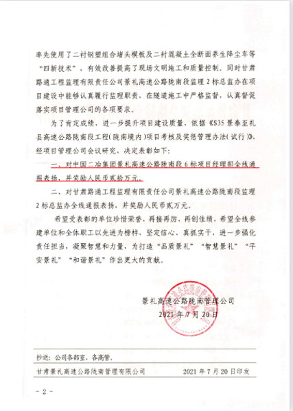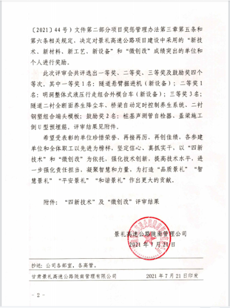 近日,甘肅分公司景禮項目部在甘肅景禮高速公路隴南管理有限公司組織的“四新技術”、“微創改”推廣應用、“品質工程”及施工標準化建設等檢查評比中名列前茅,項目管理公司對景禮項目部進行通報表揚,并給予獎勵40萬元。