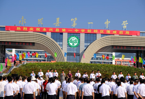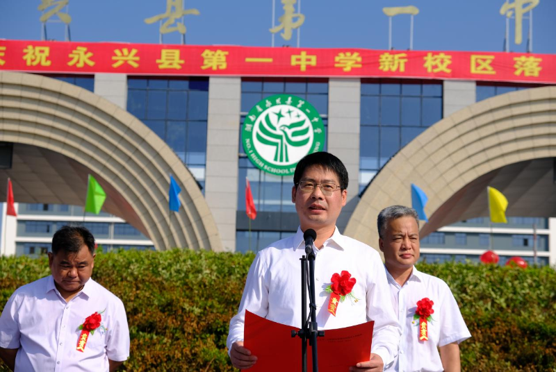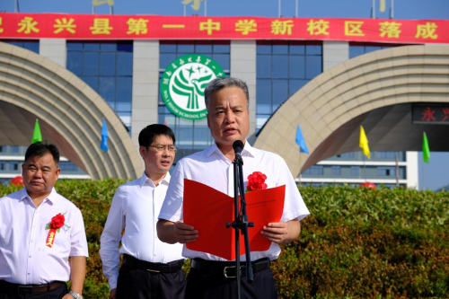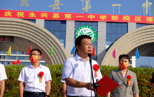揭牌儀式首先由永興一中校長(zhǎng)胡兆文致辭。他指出,永興一中項(xiàng)目建設(shè)是造福當(dāng)?shù)匕傩盏囊豁?xiàng)重大民生工程,是功在當(dāng)代,利在千秋的一件大事。他希望學(xué)生們心懷天下做有家國(guó)情懷的人,意志堅(jiān)韌做積極進(jìn)取的人,心胸開闊做陽(yáng)光大度的人,心存善意做助人為樂的人。最后,他祝學(xué)生們?cè)谛碌膶W(xué)校快樂成長(zhǎng)。
