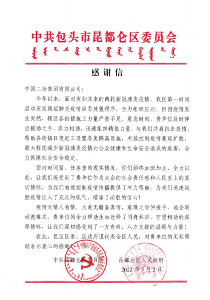 同心抗疫 共克時艱——中國二冶收到包頭市昆區區委、區政府感謝信