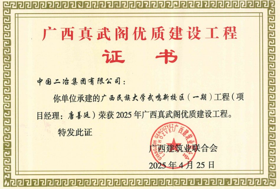 近日,廣西建筑業(yè)聯(lián)合會(huì)公布了2025年廣西建設(shè)工程“真武閣杯”獎(jiǎng)(最高質(zhì)量獎(jiǎng))工程名單,中國(guó)二冶廣西民族大學(xué)武鳴新校區(qū)(一期)工程榮獲此獎(jiǎng)項(xiàng)。